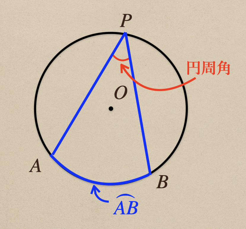 円周角と言う。\(\stackrel{\frown}{AB}\)を\(\angle{APB}\)に対する弧と言う。