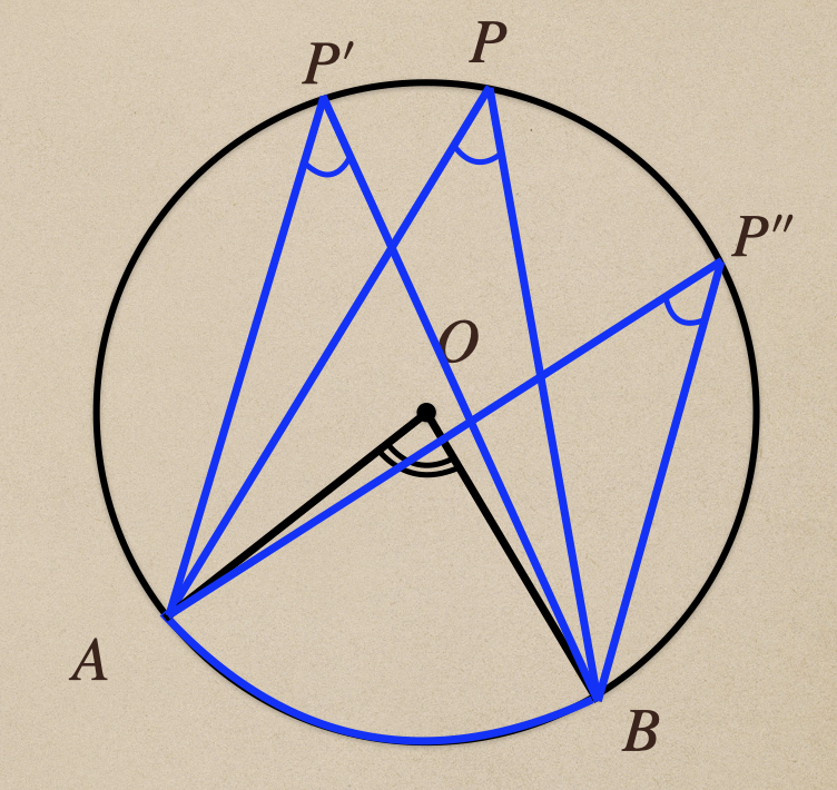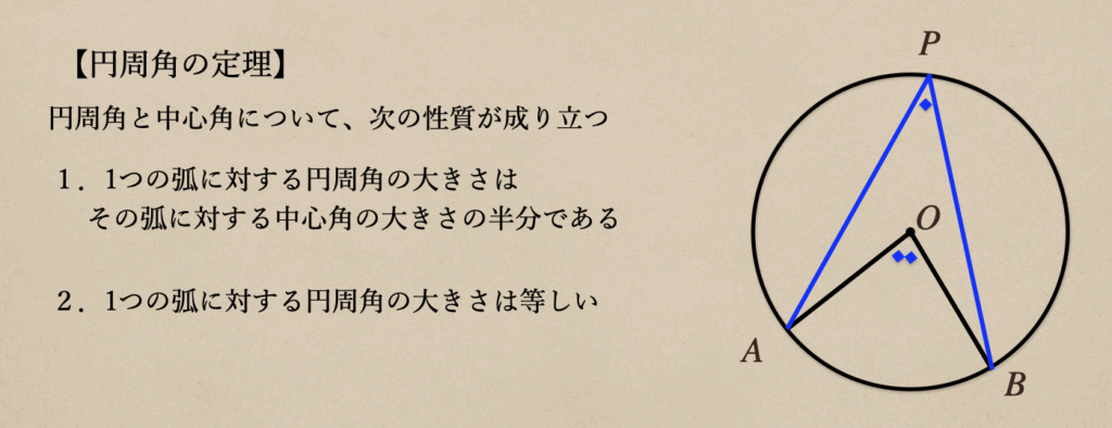 この3つの位置関係にある円周角\(\angle{APB}\)の大きさが中心角\(\angle{AOB}\)の