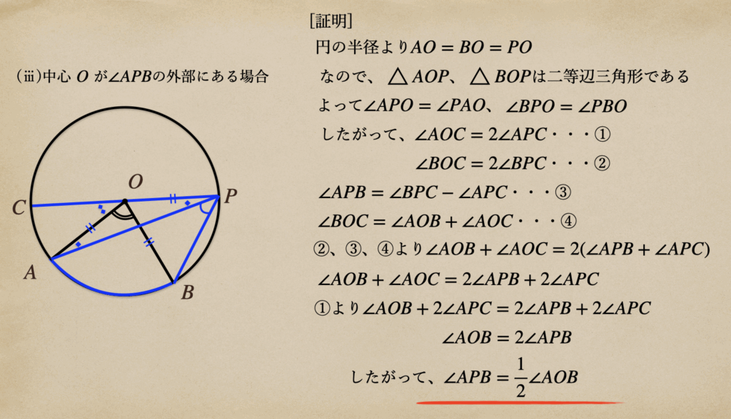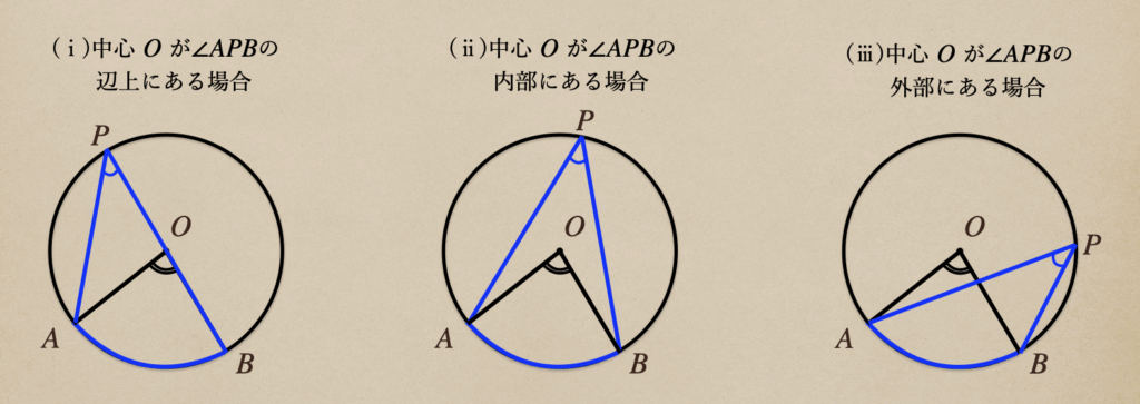 この(ⅰ)〜(ⅲ)が証明されたことで、中心角に対して円周角っていうのはどこをとっても