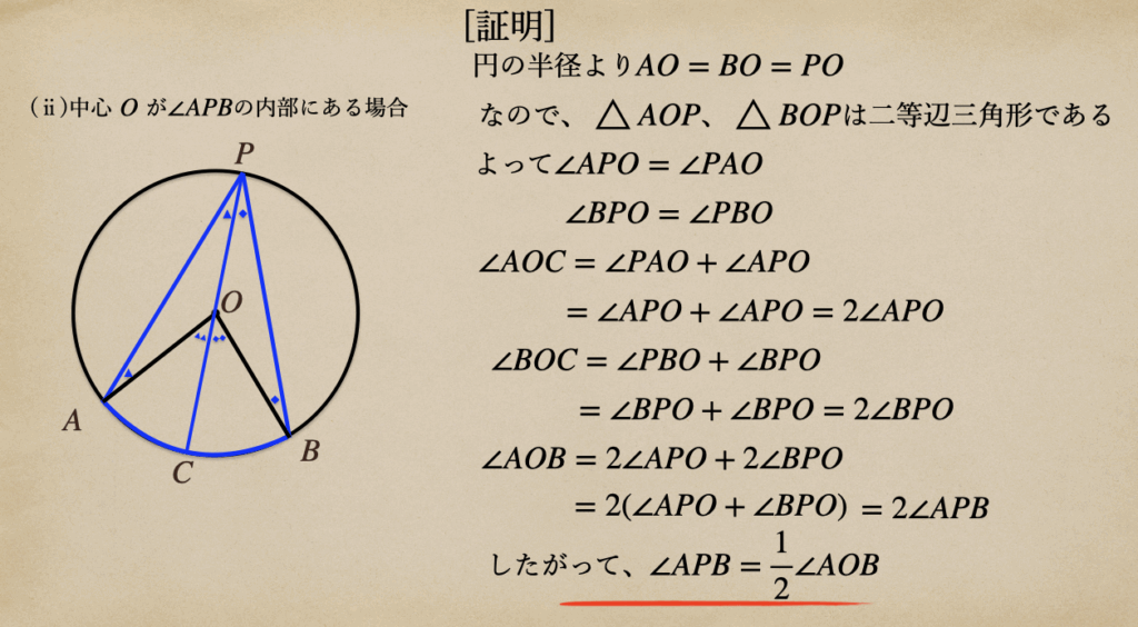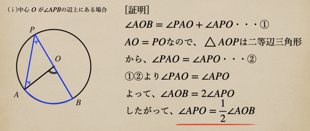 そこから、中心角\(\angle{AOB}\)と円周角\(\angle{APO}\)の関係が見えてくるんだね。