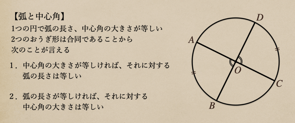また、1つの円で中心角の大きさと弧の長さは比例することから