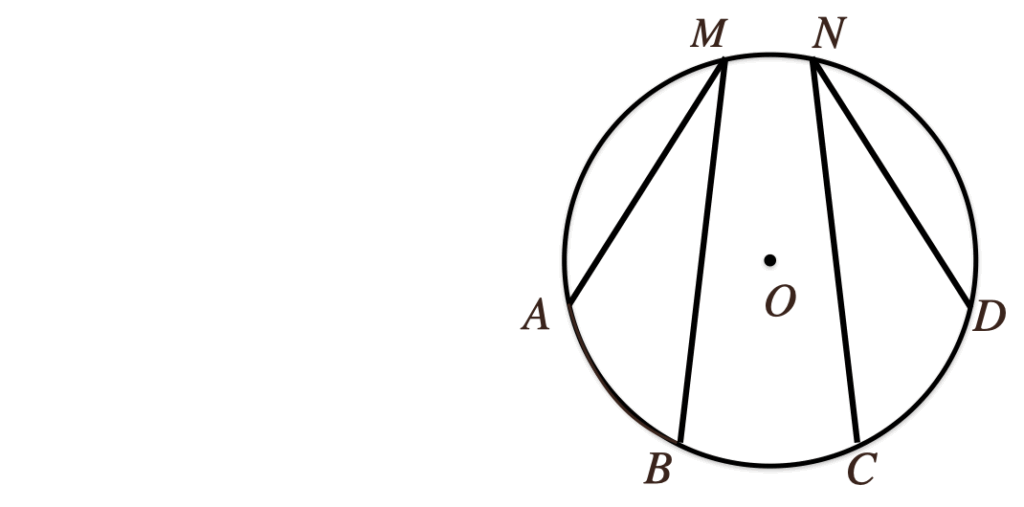 (ⅱ)\(\stackrel{\frown}{AB}=\stackrel{\frown}{CD}\)ならば\(\angle{AMB}=\angle{CND}\)であることを証明する