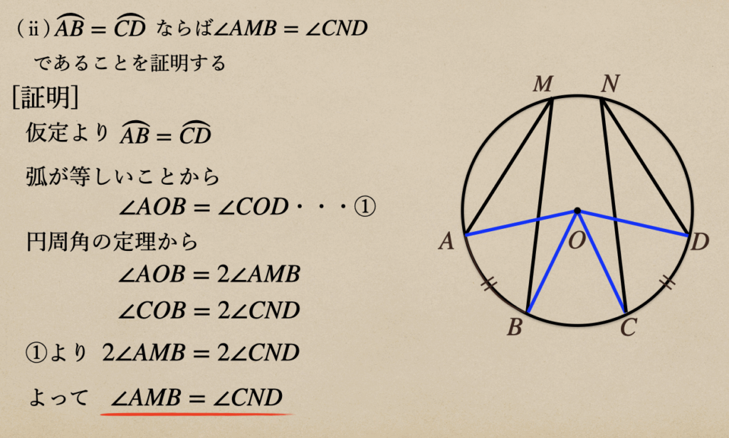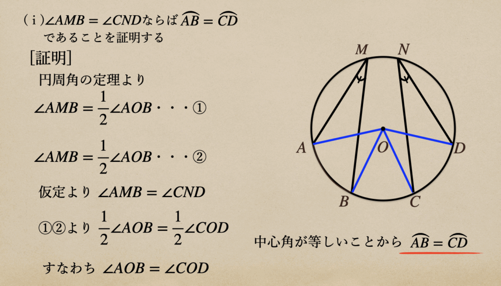 (ⅰ)\(\angle{AMB}=\angle{CND}\)ならば\(\stackrel{\frown}{AB}=\stackrel{\frown}{CD}\)であることを証明する