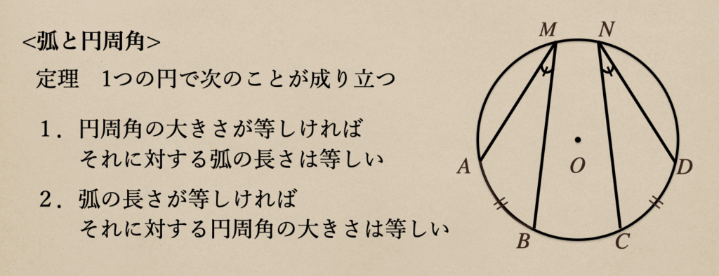 これで、弧が等しいと円周角も等しいってことが言えたので「弧と円周角」の定理として