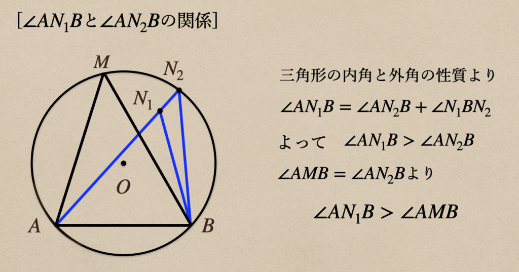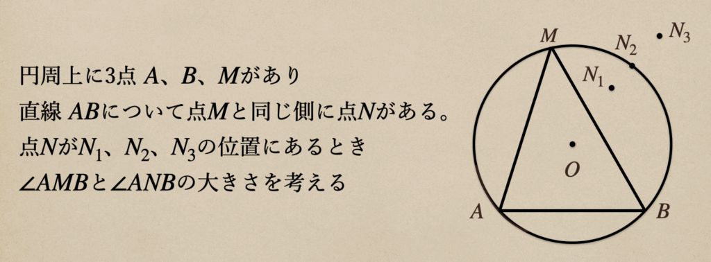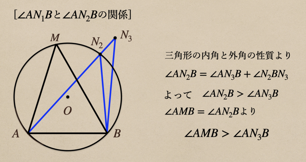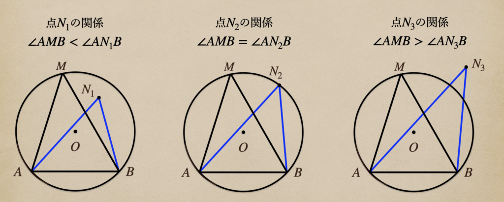 これらから、点\(N_1\)、\(N_2\)、\(N_3\)の位置と円周角である\(\angle{AMB}\)の
