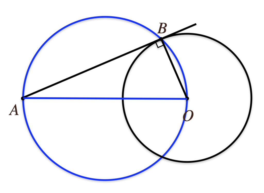 すると接線\(AB\)と\(OB\)っていうのは\(90^\circ\)ですっていうのがあったよね。