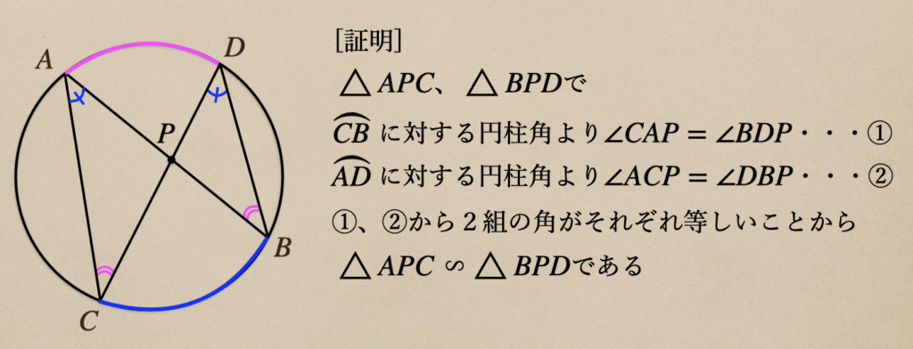 共通する弧があることから、角度が同じであることが言えて相似な関係に