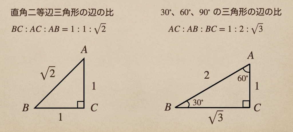 決まっているものがあるんだね。それが二等辺三角形と内角が\(30^\circ\)、\(60^\circ\)、\(90^\circ\)の