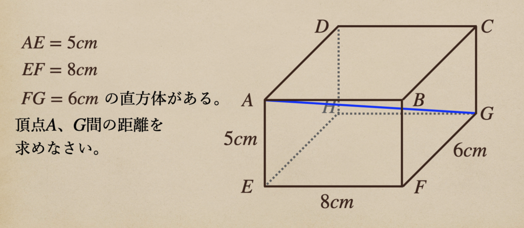 立体の対角線を求めようとするなら頂点の\(A\)、\(E\)、\(G\)を線で結んだ三角形を作って