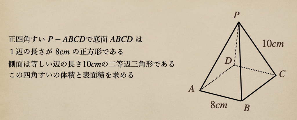 四角すいの高さは頂点\(P\)から底面\(ABCD\)に垂直に落とした線分が