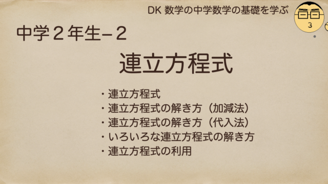 中2-連立方程式 中2-2.連立方程式 中学数学の基礎を学べるブログ。中学2年生の連立方程式について解説しているよ。ここの連立方程式の解き方(加減法、代入法)の解説や、文章問題から連立方程式を組み立てて、解を求めていくって言うところをを解説しているよ。 2022.09.12 中2-連立方程式